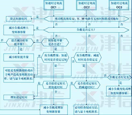 富士變頻器OC報警時,并不意味著一定是變頻器出現了故障,有可能是由于某些設定或者干擾導致,當然也有可能是由于部件異常,常見判斷故障原因和解決的步驟如下: