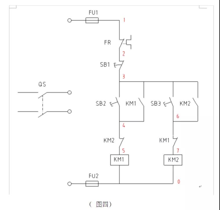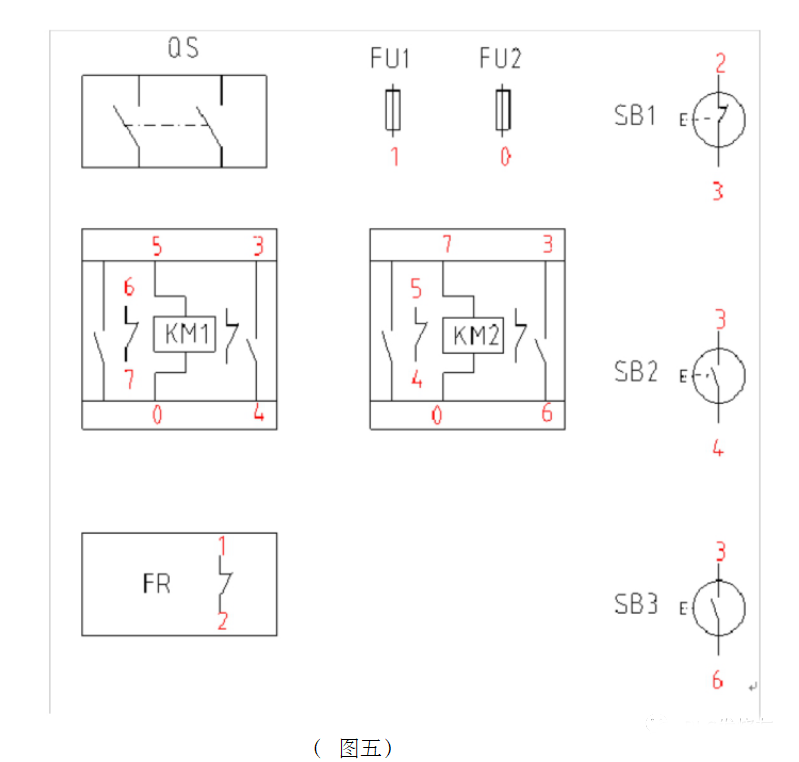 將原理圖四的號碼填入圖三所對應的器件上 如 KM1 常開點 3,4 號, 兩個線圈的一端都是 0 號。