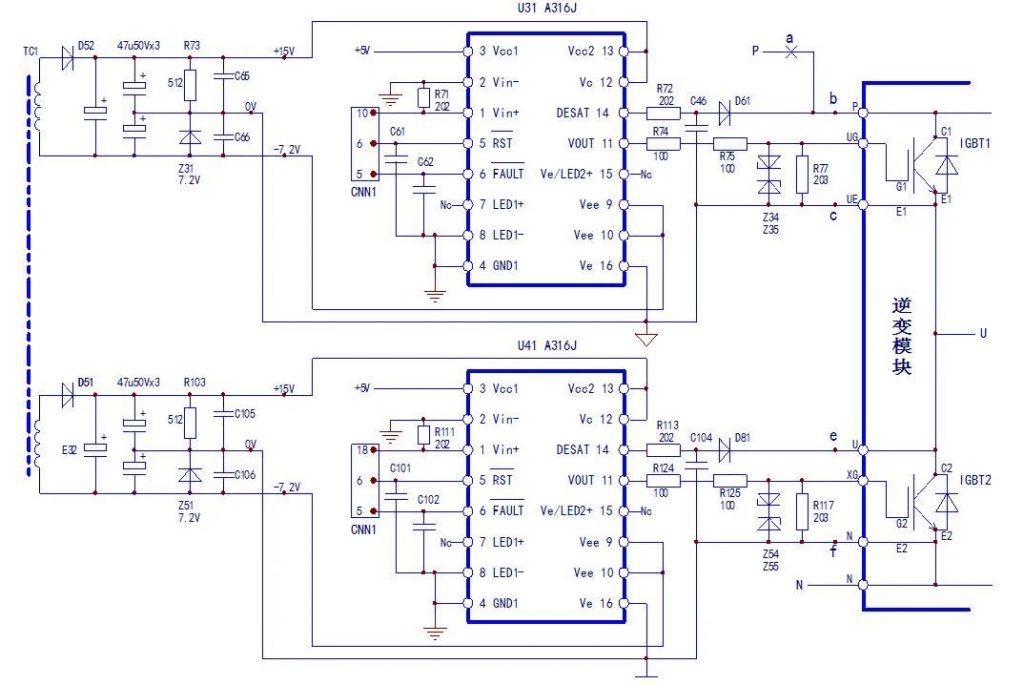 一臺阿爾法變頻器,畫出U相上下臂IGBT的驅動電路圖,可以看到,每相下臂IGBT的驅動電路共用D51、E32直流電源。驅動供電也由穩(wěn)壓電路分為+15V和-7.2V兩路電源,以形成對IGBT供電的+15V激勵電壓回路和-7.2V的截止電壓回路。驅動IC(A316J)的左側引腳為輸入側電路,右側引腳為輸出側電路。無論是脈沖信號還是OC故障信號,都由內部光耦合器電路相隔離。由PC929相比,因內部已有對OC信號的隔離,可省去外接光耦合器,并且脈沖信號、OC信號和故障復位信號可經控制端子CNN1直接與CPU脈沖輸出引腳相連。在有的變頻器電路中,僅是下三臂IGBT驅動電路采用A316J,上三管采用TLP250等。