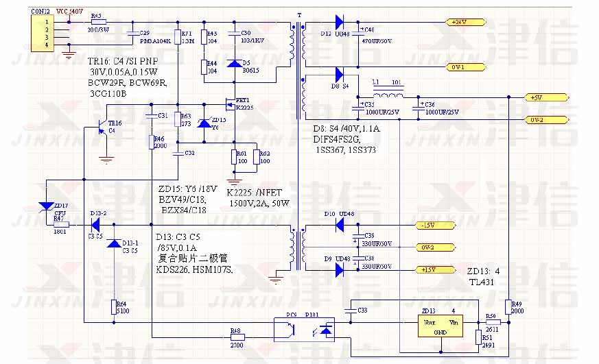 到此雖然檢修過程結束,但工作并未完成:此電源板電路是LG IS5 系列幾千瓦到幾十千瓦變頻器的通用CPU 電源板,故繪出此電路圖并標注出某些元件的參數及代換型號。當以后遇到同樣的機器時,在找不到原型號可找代換的,如果連代換的也找不到的話就以能購置到且性能最相近的元器件裝機。更重要的是,不再怕被別人修過的同型號“轉修機”,即我們行內常說的“同行機”——丟失或是換錯元器件的機子。