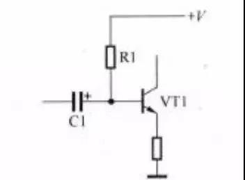 4. T1基極上的元器件有三個方向:電源方向、地線方向、前級電路方向。下圖所示是電源+V方向的R1,地線方向上大多有電阻,前級方向上大多有耦合電容。