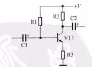 2. 在電路板上找到VT1集電極,然后畫出與集電極相連的所有元器件,并注意那個電阻與電源電路相連。下圖所示是集電極與直流工作電壓+V端之間接有一只電阻,并注意那個耦合電容與下級放大器相連。