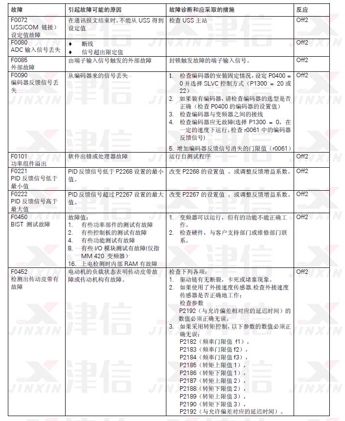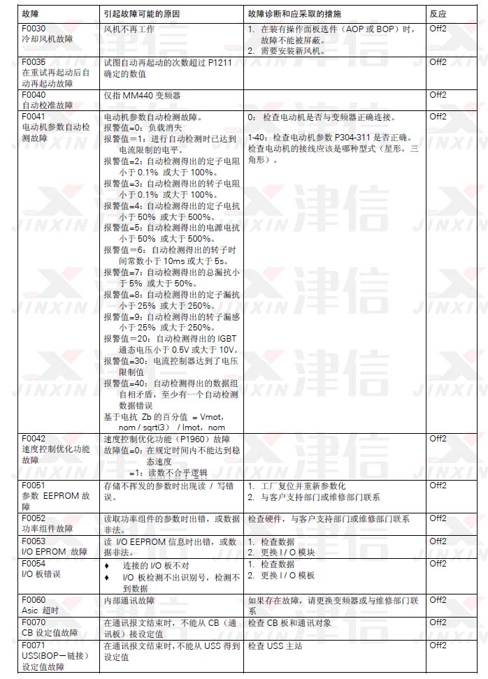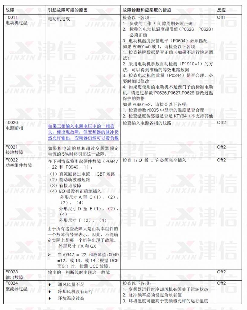 故障信息以故障碼序號的形式存放在參數R0947 中(例如,F0003=3)。相關的故障值可以在參數R0949 中查到,如果該故障沒有相關的故障值,R0949 中將輸入0。而且,可以讀出故障發生的時間(R0948)和存放在參數R0947 中的故障信息序號(P0952)。